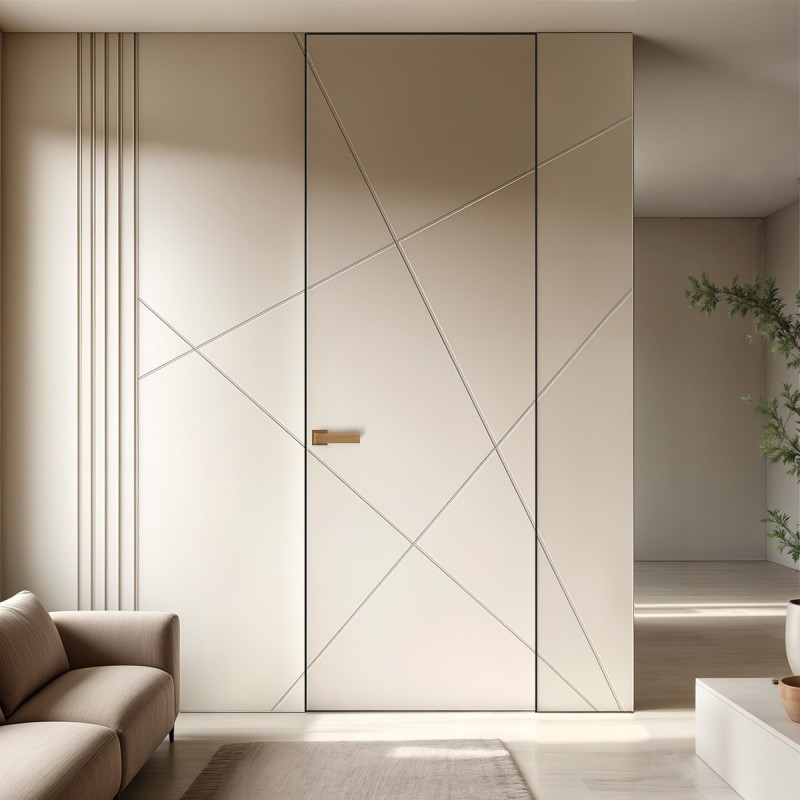 Son puertas hasta el techo, que no tienen tapetas, van enrasadas directamente a la pared, a su mismo nivel, lo que hace que parezcan puertas invisibles u ocultas, creando una continuidad y armonía estética en las paredes de tu hogar.