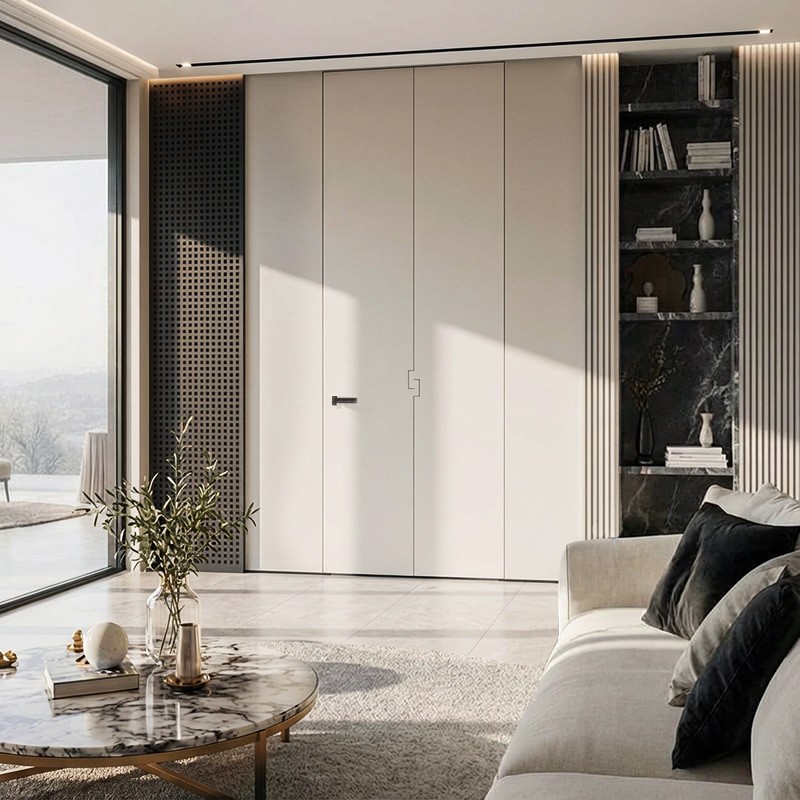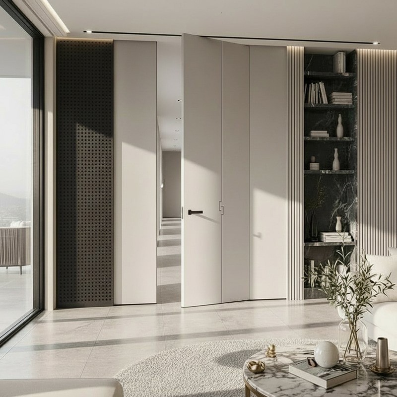 Son puertas hasta el techo, que no tienen tapetas, van enrasadas directamente a la pared, a su mismo nivel, lo que hace que parezcan puertas invisibles u ocultas, creando una continuidad y armonía estética en las paredes de tu hogar.