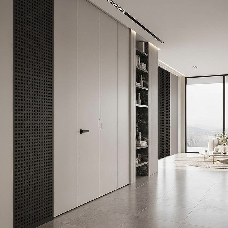 • Paredes interminables, continuidad entre ellas, ya que son puertas que se suelen instalar enrasadas, pasan desapercibidas, por lo que se conocen habitualmente como puertas invisibles u ocultas. Pueden colocarse bien enrasadas a pared sin tapetas o jambas, o poner tapetas y enrasarlas a las mismas.