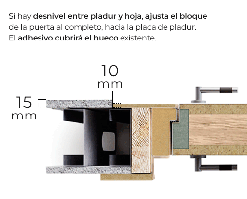 Si al instalar la puerta detectas que la placa de pladur no queda alineada con la hoja o el cerco, lo más recomendable es desplazar la puerta en bloque hasta conseguir que todos los elementos queden a nivel.