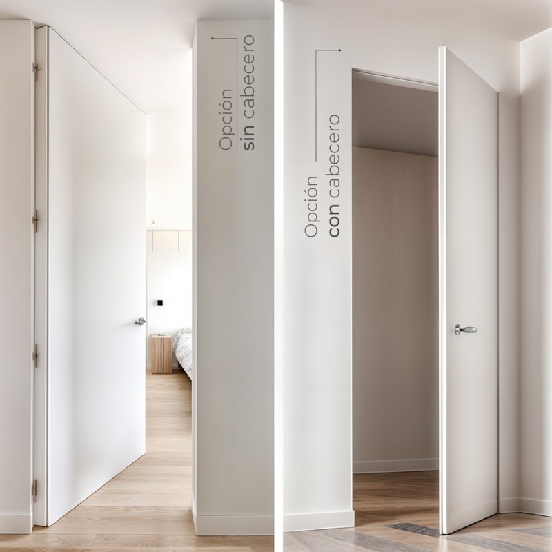 Son puertas hasta el techo, que están enrasadas a las tapetas, es decir al mismo nivel, sin escalones, con dicha tapeta / tapajunta. Este tipo de puerta suelo a techo, no lleva cabecero, únicamente llevaría las dos tapajuntas laterales. No obstante, existe la opción de colocar cabecero en la parte superior, para cubrir cualquier necesidad de aislamiento acústico o térmico.
