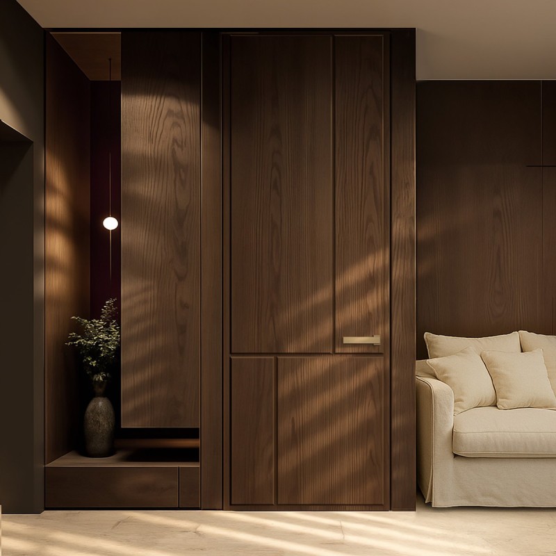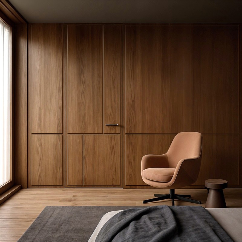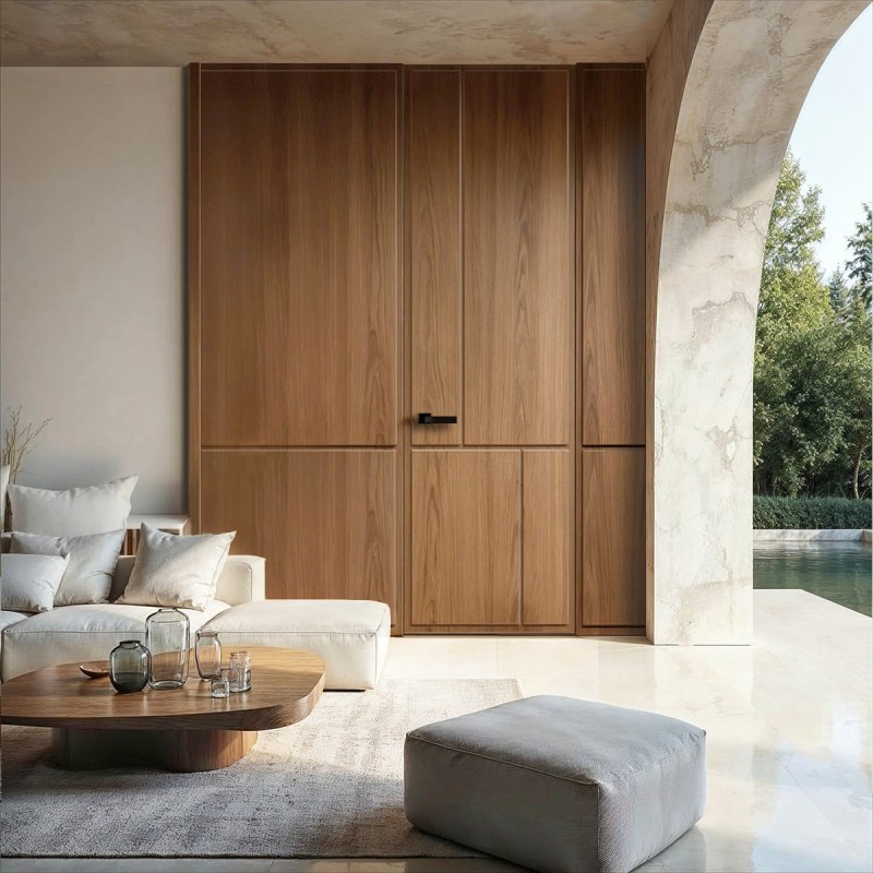 Como idea, ésta integración que recorre pared y techo como una piel continua, sin marcos visibles, con herrajes ocultos y un acabado que respira nobleza, calidez y transforma la arquitectura en atmósfera.