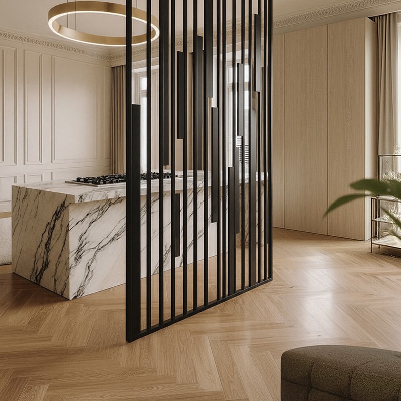 Fabricado en DM macizo lacado, este separador está inspirado en el estilo japonés, donde la sencillez y la armonía son esenciales. Sus listones verticales generan un ritmo visual equilibrado que divide los espacios con elegancia y serenidad, permitiendo el paso de la luz y manteniendo una conexión fluida entre ambientes.